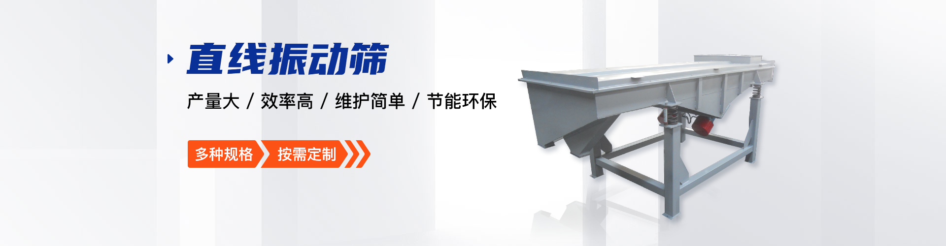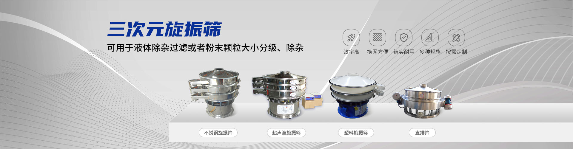 公司的主要產(chǎn)品有:三次元旋振篩、直線振動(dòng)篩、圓形搖擺篩、方形搖擺篩、脫水篩、超聲波振動(dòng)篩、塑料振動(dòng)篩、直排篩、高頻篩、450過濾篩、實(shí)驗(yàn)篩、斗式提升機(jī)、皮帶輸送機(jī)、過濾器、振動(dòng)電機(jī)等,